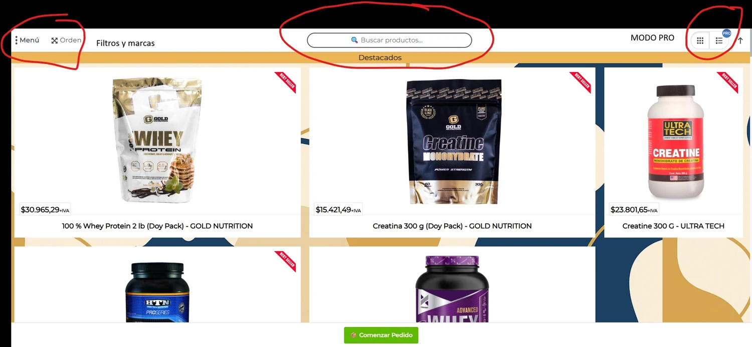 Derecha superior: MODO PRO para cargar con vista reducida para pedidos grandes