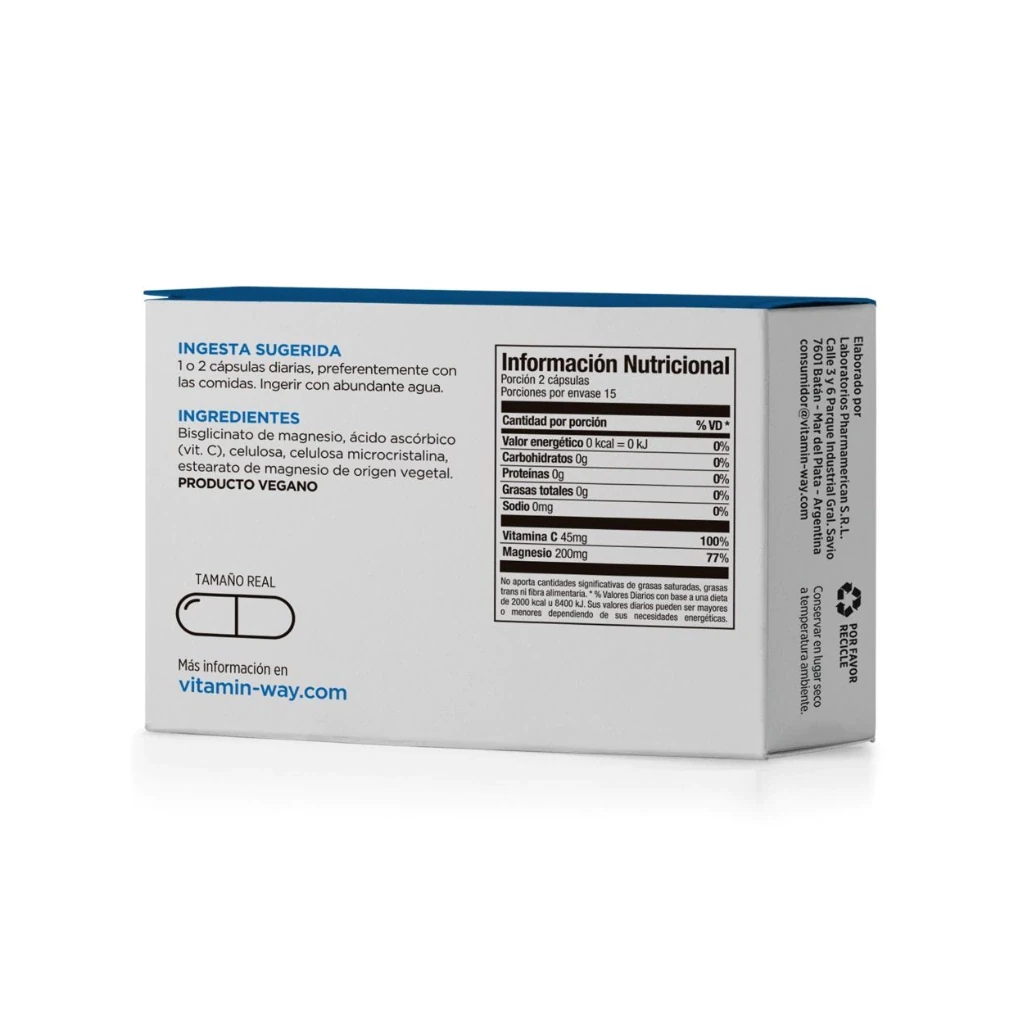 Ingredientes por porción: Bisglicinato de Magnesio (equivalente a 200 mg de magnesio elemental), vitamina C 45 mg.