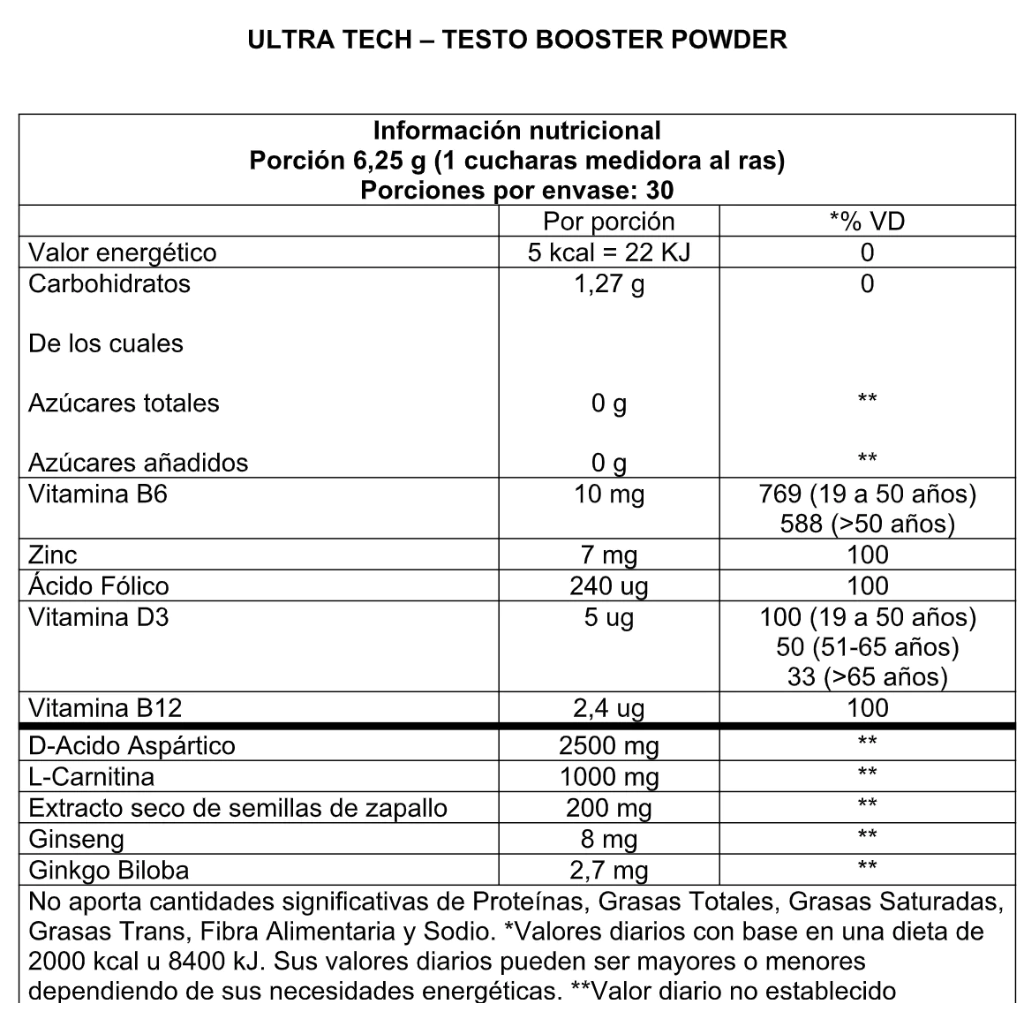 Si bien hay tratamientos a base de testosterona artificial para contrarrestar esa deficiencia, dichos tratamientos tienen decenas de efectos negativos para la salud. Es por ello que Ultra Tech ha desarrollado TESTO BOOSTER POWDER, una fórmula exclusiva basada en una combinación de ingredientes que en las proporciones exactas, ayudan a la producción natural de testosterona dentro del organismo, y sin utilizar ninguna clase de hormona ni sustancia química nociva para la salud.