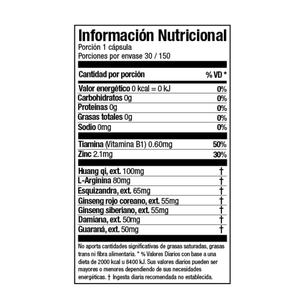 Ingredientes por cápsula: “Huang qi” astrágalo 100 mg, L-arginina 80 mg, esquizandra 65 mg, ginseng rojo coreano 55 mg, ginseng siberiano 55 mg, damiana 50 mg, guaraná 50 mg, zinc 2.1 mg, vitamina B1 0.6 mg.