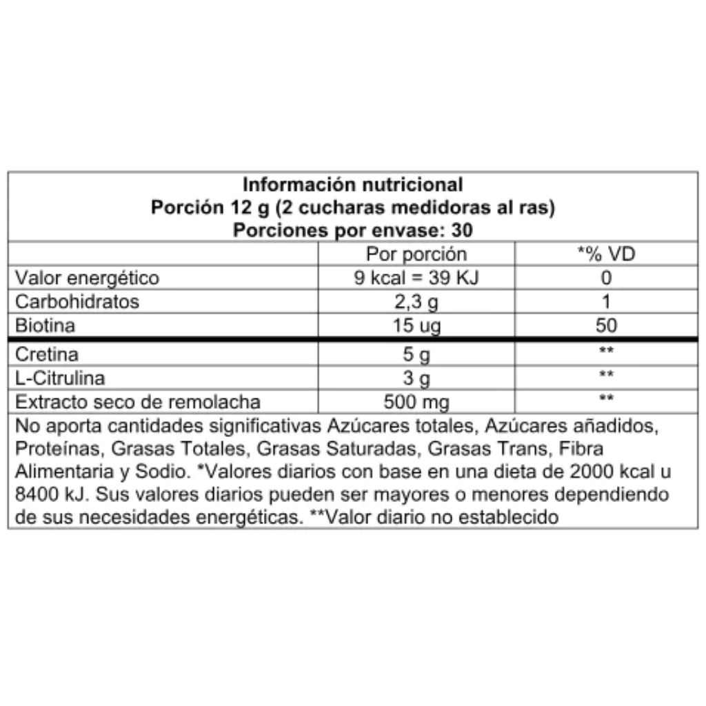 Cada porción de CREATINE + NITRIC OXIDE PUMP aporta 3 g del aminoácido L-citrulina, 500 mg de extracto concentrado de remolacha, y 5 g de Creatina.