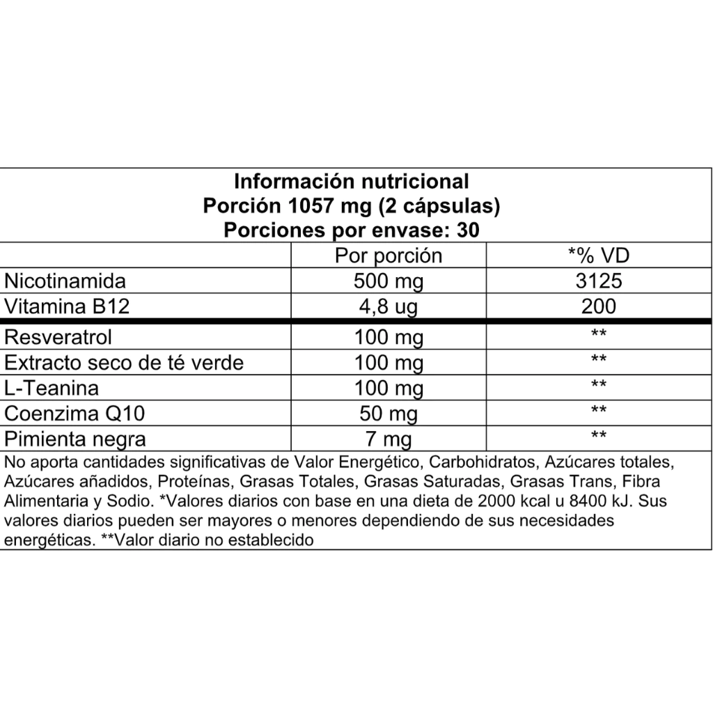NAD+ Resveratrol Complex es un suplemento avanzado diseñado para apoyar el rejuvenecimiento desde el interior gracias a su exclusiva fórmula que combina Nicotinamida (el mayor precursor de NAD), antioxidantes clave como el Resveratrol (activador de sirtuinas para prolongar la vida de las células) y la Coenzima Q10, Teanina (enfoque mental y bienestar), y extractos naturales potenciadores del NAD como el Té Verde y la Pimienta Negra.