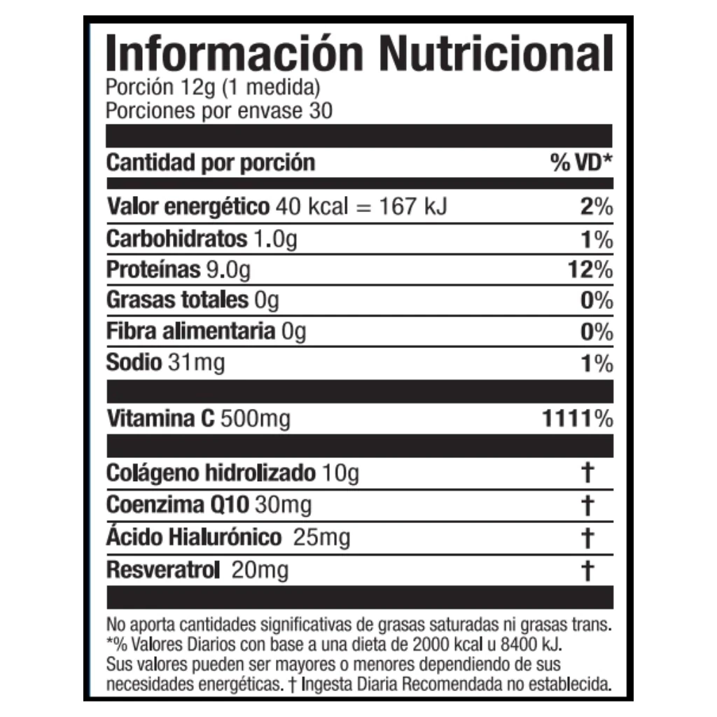 Por porción: Colágeno hidrolizado 10 g, Vitamina C (ácido ascórbico) 500 mg, coenzima Q10 30 mg, ácido hialurónico 25 mg, resveratrol 20 mg.