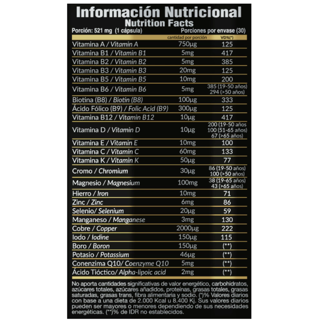 Con 30 nutrientes esenciales, de la vitamina A al Zinc, para cubrir tus necesidades diarias con una sola cápsula.