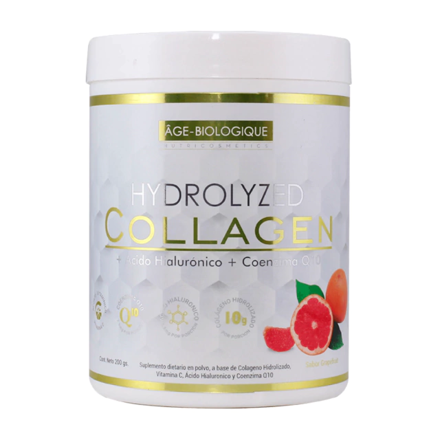 ¿Cómo actúa Hydrolyzed Collagen®? Hydrolyzed Collagen® bebible de Age-Biologique® es un suplemento dietario en polvo a base de Colágeno Hidrolizado, Ácido Hialurónico, Coenzima Q10 y Vitamina C con sabor a pomelo rosado.
