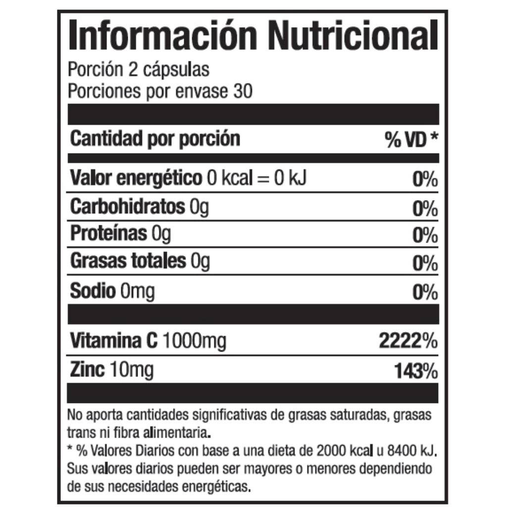 Ingredientes por cápsula: Vitamina C 500 mg, Zinc 5.0 mg.