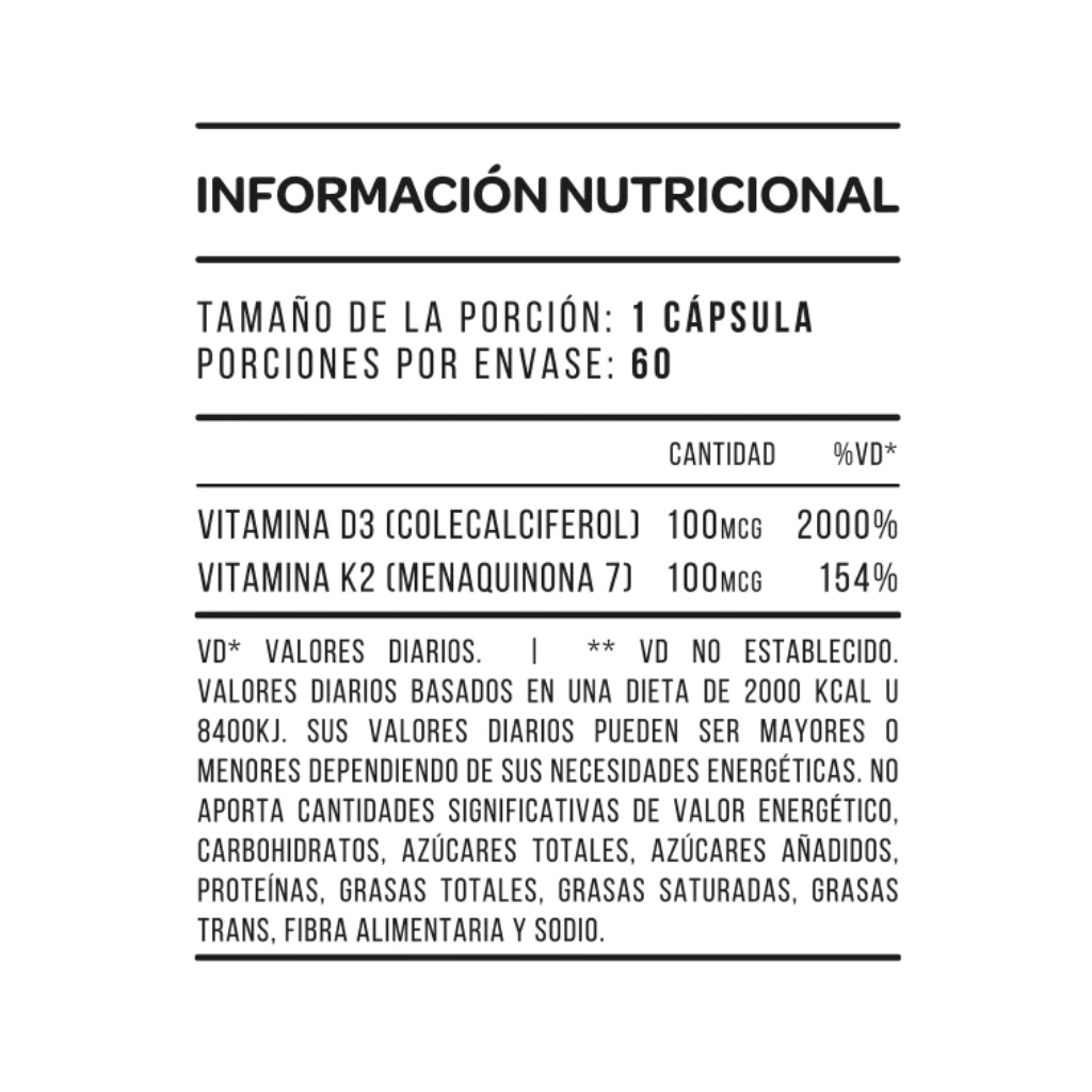 Beneficios principales: - Fortalecimiento óseo gracias a una mejor absorción y utilización del calcio. - Protección del sistema cardiovascular al evitar la calcificación en arterias y otros tejidos blandos. - Sinergia perfecta para mantener huesos fuertes y un corazón saludable.