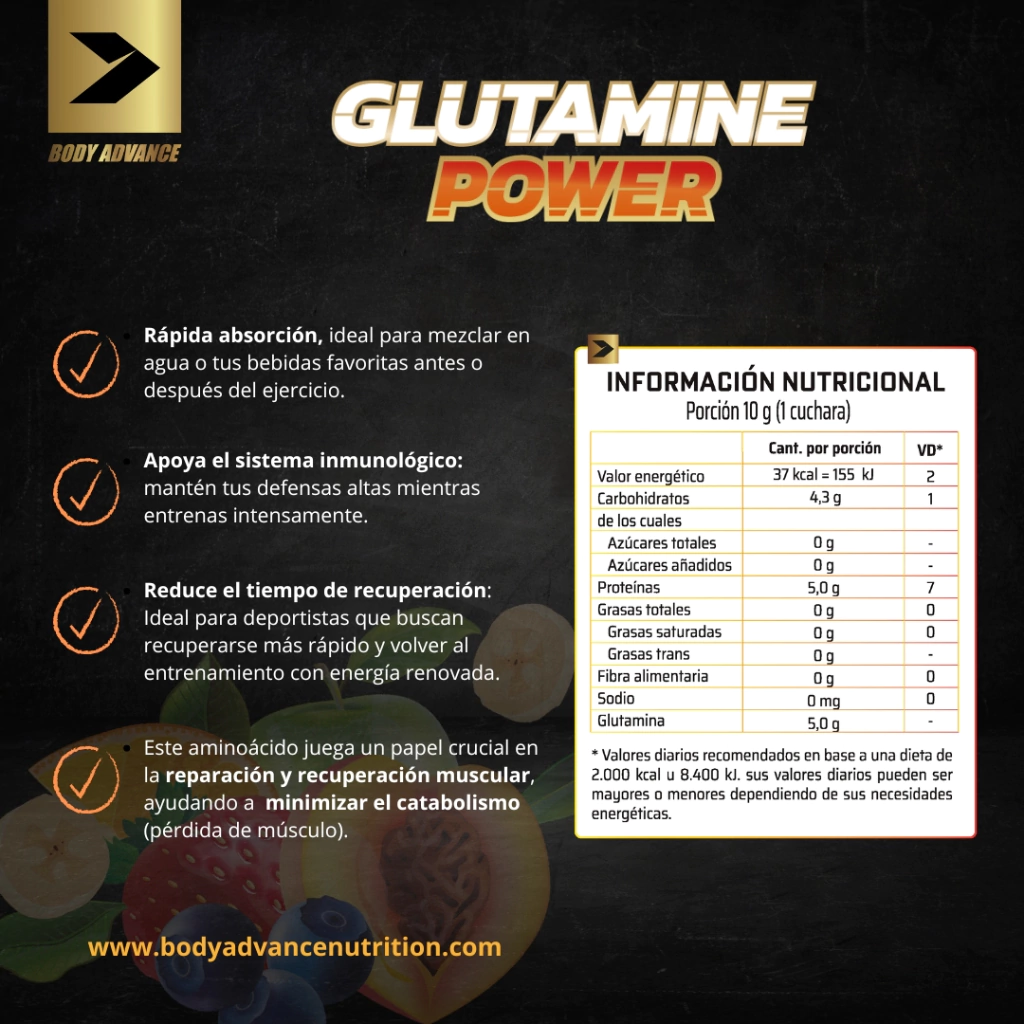 – 5 gramos de glutamina por porción : Ideal para apoyar la recuperación muscular y reducir el catabolismo después del entrenamiento.