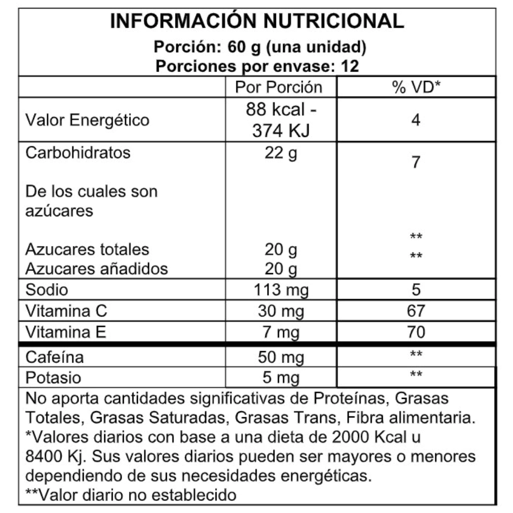 Complemente sus geles energéticos intercalando los mismos con ENERGY GEL CON CAFEINA para obtener energía, hidratación y ayudar a energizar también la mente, todo en uno. No consumir más de 4 geles con cafeína en el día.