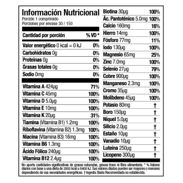Ayuda a fortalecer energía y vitalidad. Ayuda a reforzar las defensas. Aporta los beneficios esenciales de 13 vitaminas y 17 minerales. Complementa la nutrición diaria. Cubre deficiencias nutricionales.