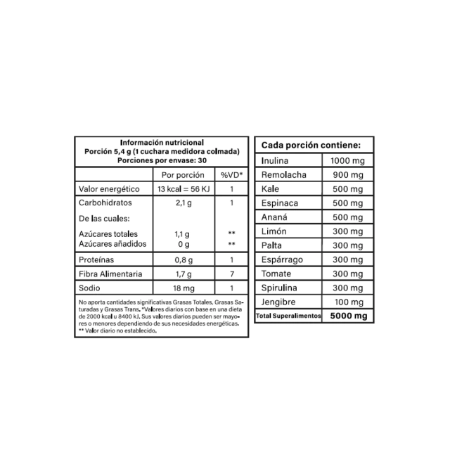 Es muy importante destacar que este producto contiene ademas fibras prebioticas naturales de achicoria, que favorecen el crecimiento de bacterias beneficiosas, lo cual mejora la digestión y ayuda a reducir la hinchazón abdominal.