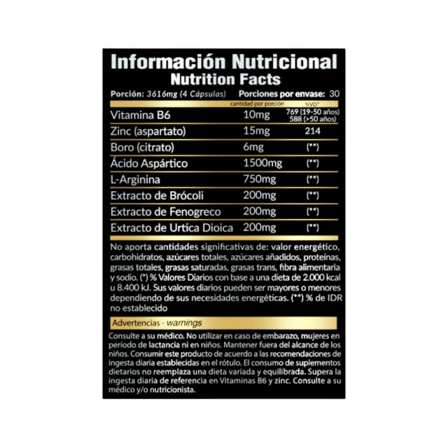 Este desarrollo de fórmula avanzada combina aminoácidos, minerales esenciales y extractos vegetales estandarizados que actúan de forma sinérgica para estimular la producción endógena de testosterona y optimizar el equilibrio hormonal masculino.
