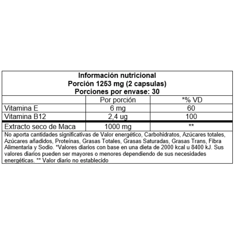 Formulada con la más pura maca peruana y potenciada con vitamina B12, que contribuye a la producciĂłn de energĂa y a reducir el cansancio y la fatiga, y vitamina E, un antioxidante esencial que protege las cĂ©lulas del estrĂ©s oxidativo y favorece el bienestar hormonal.