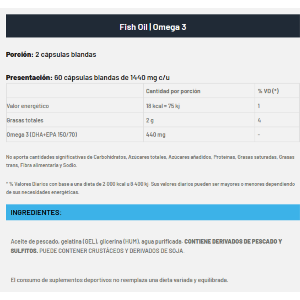 La fórmula de Fish Oil es un concentrado de aceite de pescado, rico en ácidos grasos Omega-3, DHA y EPA, que contribuyen a mantener el funcionamiento normal del cerebro, del corazón y la vista. Ideal para quienes entrenan y cuidan su bienestar a diario.
