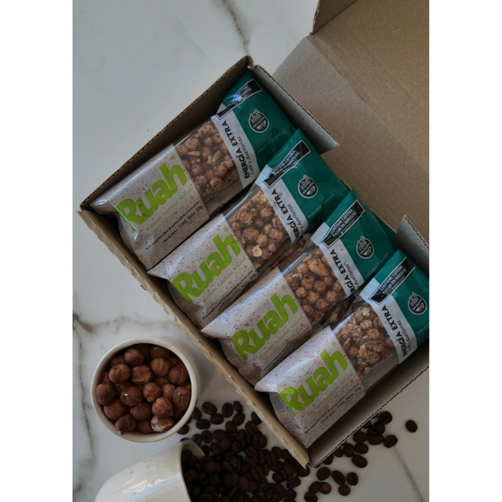 Ingredientes: Quinoa inflada, pasta de maní, Miel, Fibra soluble (FOS), maní tostado, avellanas, semillas de girasol, algarroba, café en grano molido, albúmina de huevo.