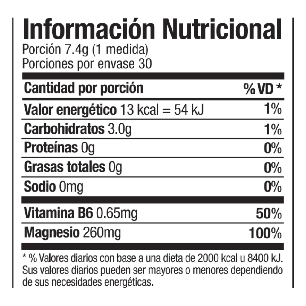 Por porción: Magnesio (bisglicinato, citrato, lactato, gluconato y óxido) 260 mg, vitamina B6 (piridoxina) 0.65 mg.